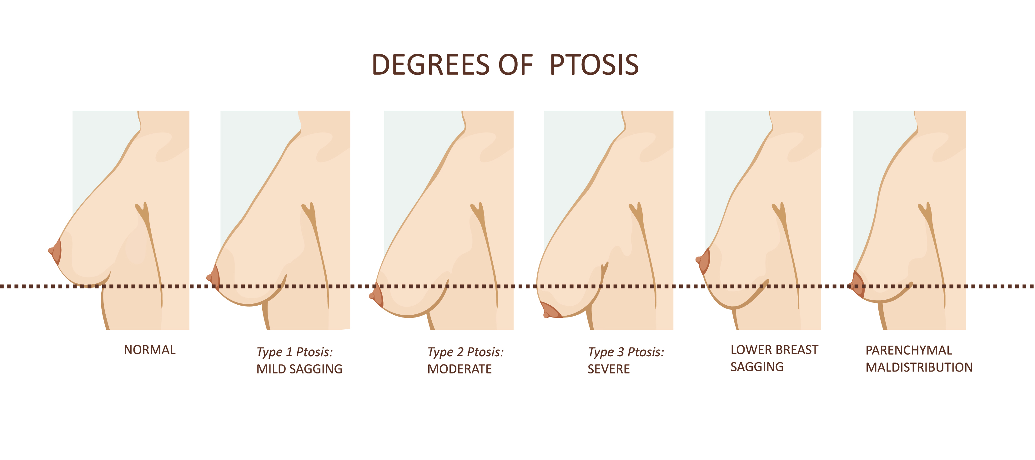 - Grade I ptosis is mild sagging where the nipple is in line with the level of the inframammary fold but is still above the lower pole of the breast.