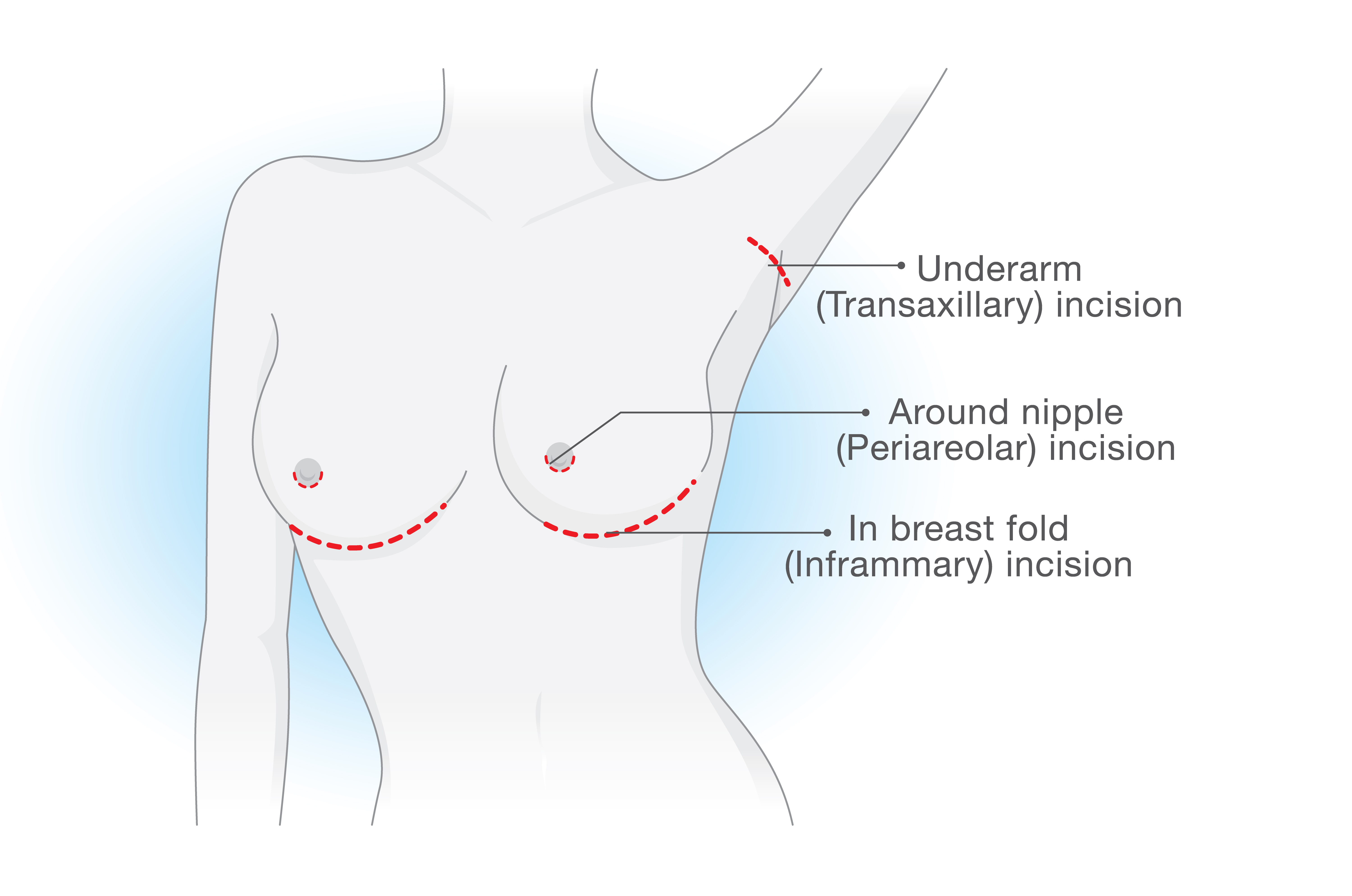 There are three theoretical incisions options available for MTF top surgery. These include the transaxillary (in the armpit), periareolar (through the bottom half of the areola), or inframammary (along the breast crease) locations.
