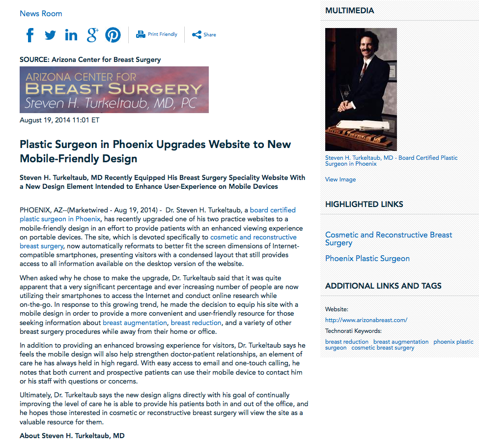 Phoenix, AZ — Dr. Steven H. Turkeltaub, a board certified plastic surgeon in Phoenix, has recently upgraded one of his two practice websites to a mobile-friendly design in an effort to provide patients with an enhanced viewing experience on portable devices. The site, which is devoted specifically to cosmetic and reconstructive breast surgery, now automatically reformats to better fit the screen dimensions of Internet-compatible smartphones, presenting visitors with a condensed layout that still provides access to all information available on the desktop version of the website.