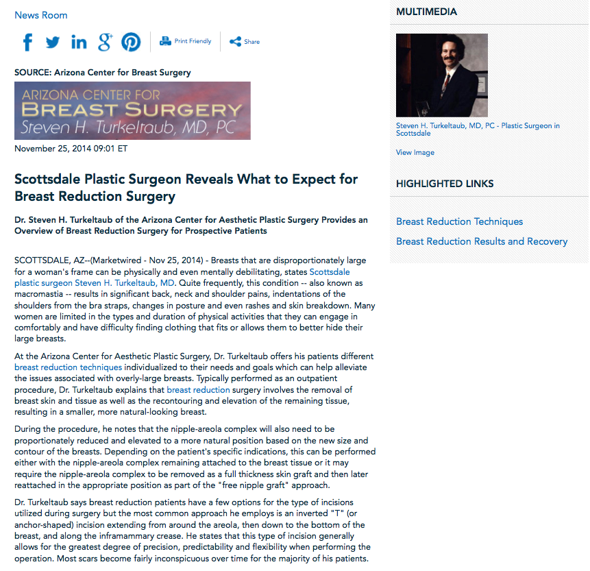 A graduate of the honors Six-Year Medical Program at Boston University and Boston University School of Medicine, Dr. Turkeltaub is renowned for his expertise in the field of aesthetic surgery. After earning his medical degree, he went on to complete his general surgery residency at the University of Miami/Jackson Memorial Hospital in Miami and Northwestern Medical Center in Chicago, followed by his plastic surgery training at the University of Massachusetts Medical Center. In addition to breast reduction surgery, Dr. Turkeltaub offers breast augmentation, abdominoplasty, facelift surgery, and a variety of other cosmetic treatments and procedures at the Arizona Center for Aesthetic Plastic Surgery. He is certified by the American Board of Plastic Surgery, and he is actively involved in several esteemed medical organizations. He is also available for interview upon request.