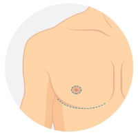 Keyhole mastectomy – With this technique, a mastectomy (removal of the breast tissue) is performed through an incision involving the lower half of the areola, making the ultimate scar fairly inconspicuous. This is a good choice when the breasts are small and have good skin tone. If the areolas are large, they can be reduced in size at the same time by extending the incision around the whole areola and removing a “donut” of skin (see B).