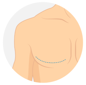 Inverted “T” mastectomy – This is the same configuration as that performed for most breast reduction procedures and involves an incision extending from around the areola then down to and along the crease at the lower part of the breast. With this technique, the nipple-areola complexes can either remain attached to underlying tissues or be removed and repositioned back as full thickness skin grafts.